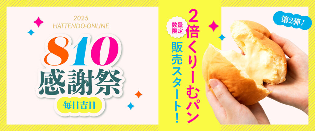 株式会社八天堂(本社:広島県三原市、代表取締役社長:森光孝雅)は、2025年8月8日(金)より810感謝祭第2弾を開催、パン生地・クリームを増量した「2倍くりーむパン」を八天堂オンラインショップで販売開始しました。
